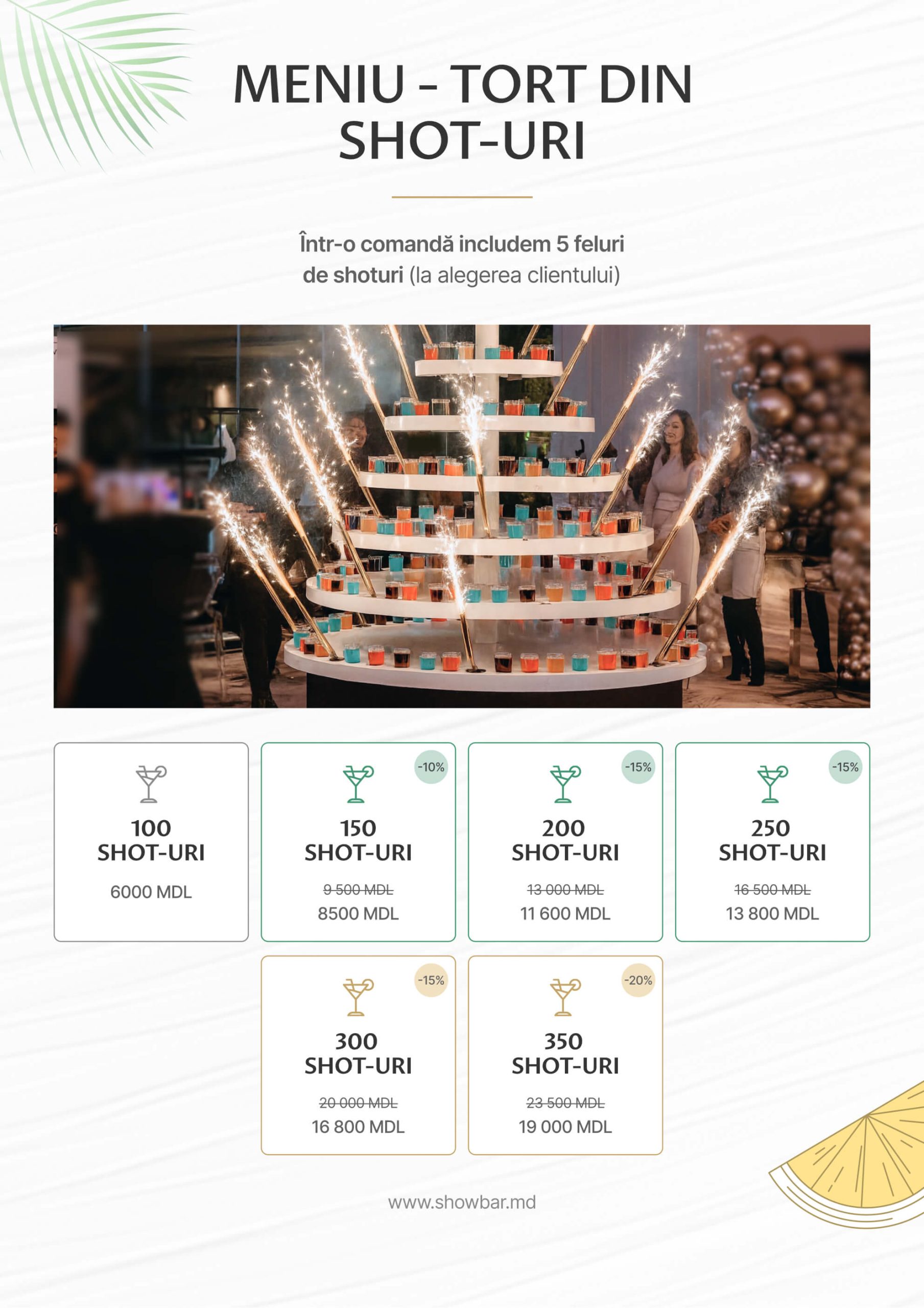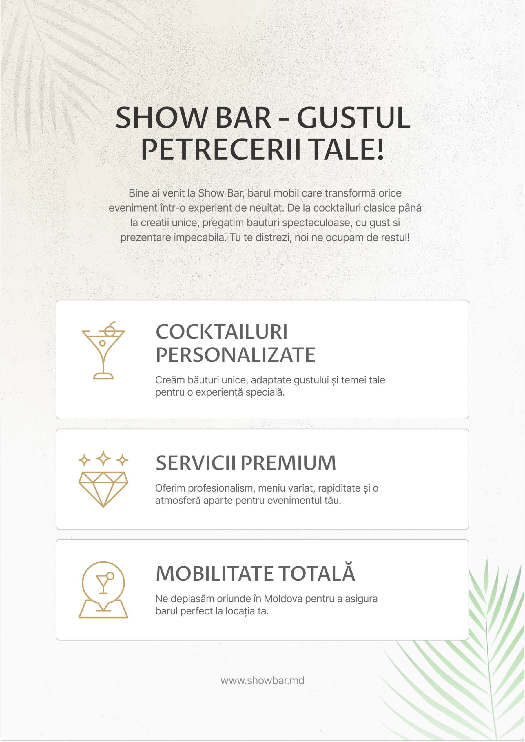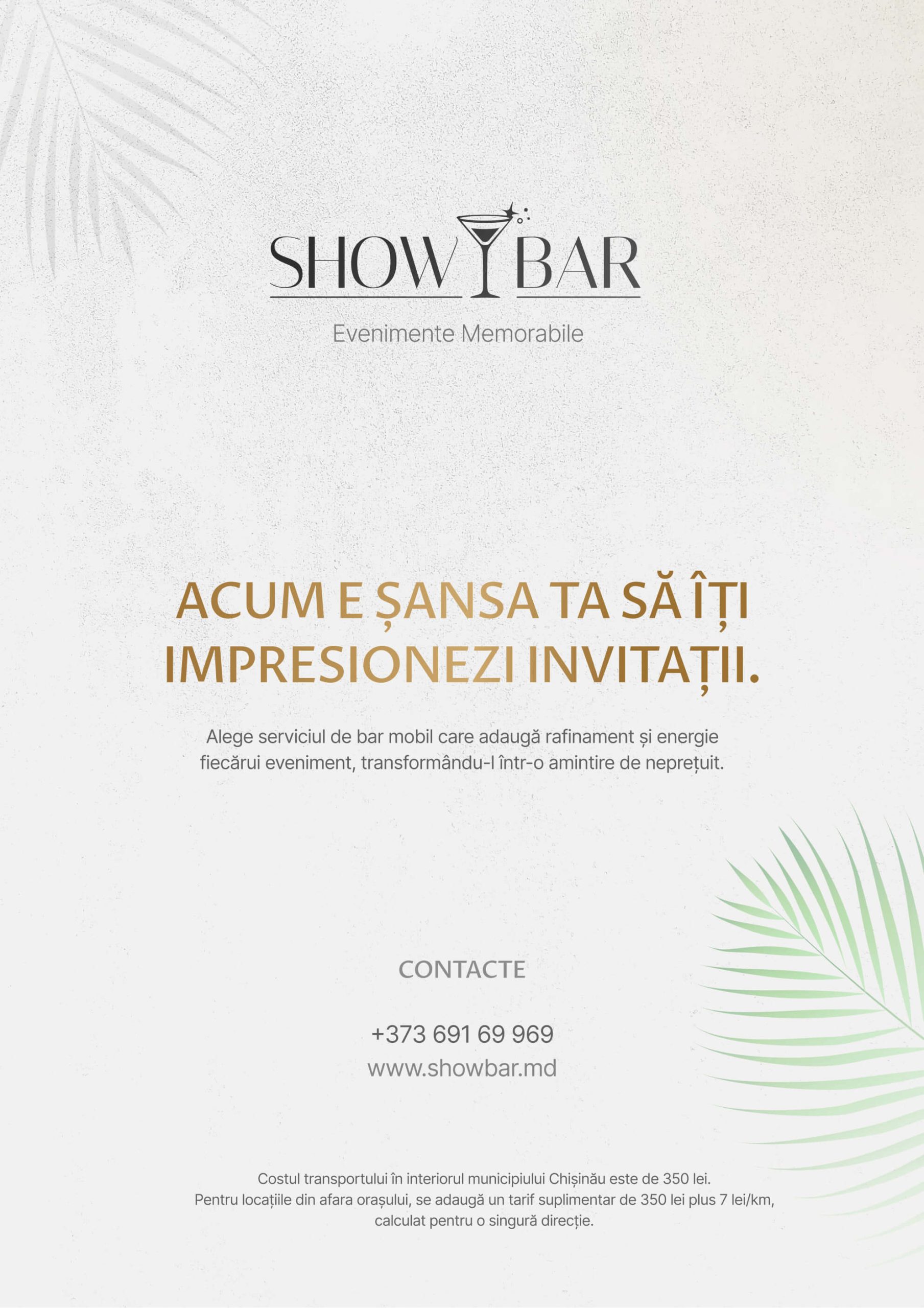 Show Bar este barul mobil care aduce gustul petrecerii tale oriunde în Moldova. Oferim cocktailuri personalizate, unice și spectaculoase, pregătite cu profesionalism pentru a face din orice eveniment o experiență memorabilă. Rapiditate, diversitate în meniu și o atmosferă vibrantă – tu te distrezi, iar noi ne ocupăm de bar!